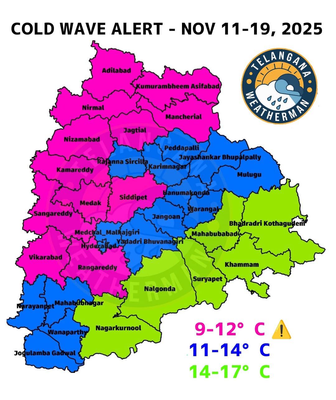 వాతావరణ మున్సూచికల ప్రకారం, పింక్ రంగులో గుర్తించబడిన జిల్లాల్లో ఉష్ణోగ్రతలు సింగిల్ డిజిట్కు (10° సెల్సియస్ కంటే తక్కువ) పడిపోవచ్చు. ఇది రాష్ట్రంలోని ఉత్తర, పశ్చిమ భాగాలను ప్రధానంగా ప్రభావితం చేయనుంది. అయితే, బ్లూ రంగు జిల్లాలు – హైదరాబాద్తో సహా – ఉదయం సమయంలో 11° సెల్సియస్ నుండి 14° సెల్సియస్ మధ్య ఉష్ణోగ్రతలు నమోదు కానున్నాయి.