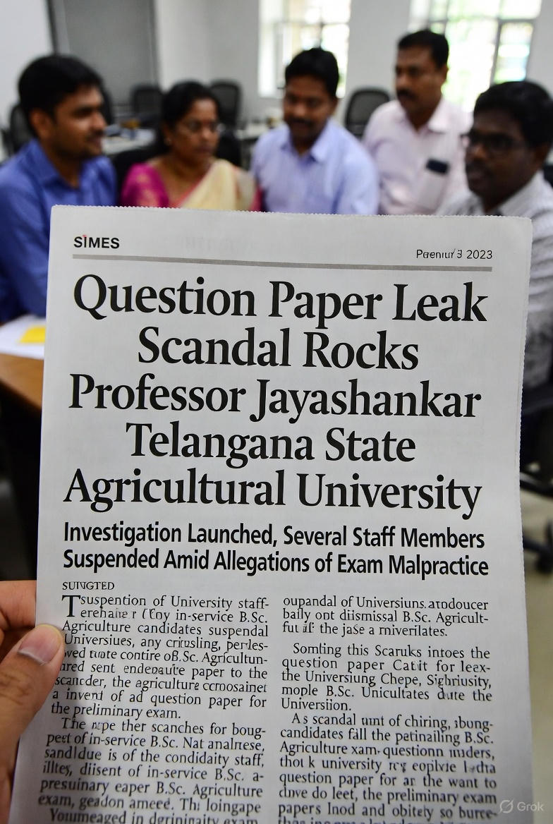 ప్రొఫెసర్ జయశంకర్ అగ్రికల్చర్ యూనిరవ్సిటీలో ప్రశ్నపత్రాల లీకేజీ వ్యవహారం వెలుగులోకి రావడం తీవ్ర సంచలనంగా మారింది. సెమిస్టర్ ఫైనల్ పరీక్షల ప్రశ్నపత్రాలు లీక్ అయిన ఘటనపై వర్సిటీ వీసీ అల్డాస్ జానయ్య సమగ్ర విచారణకు ఆదేశాలు జారీ చేసారు . ఈ కుంభకోణంలో పాత్ర ఉన్న నలుగురు వర్సిటీ సిబ్బందిని సస్పెండ్ చేస్తూ వర్సిటీ ఉత్తర్వులు జారీ చేసింది. అదే విధంగా ఇన్ సర్వీస్ కోటాలో చదువుతున్న దాదాపు 35 మంది బీఎస్సీ (అగ్రికల్చర్) మూడో సంవత్సరం అభ్యర్థుల ప్రవేశాలను రద్దు చేసి, వారిని వ్యవసాయ శాఖకు తిరిగి పంపిస్తూ నిర్ణయం తీసుకుంది.