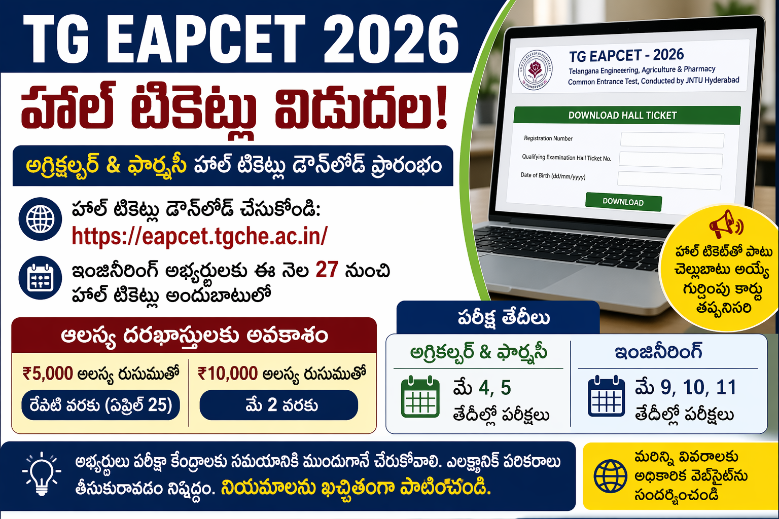 హైదరాబాద్, ఏప్రిల్ 24: తెలంగాణ రాష్ట్ర ఇంజినీరింగ్, అగ్రికల్చర్, ఫార్మసీ కామన్ ఎంట్రన్స్ టెస్ట్ (TG EAPCET 2026)కు సంబంధించిన కీలక ప్రకటనను ఉన్నత విద్యామండలి విడుదల చేసింది. అగ్రికల్చర్, ఫార్మసీ విభాగాలకు సంబంధించిన హాల్ టికెట్లు ఇప్పటికే అందుబాటులోకి వచ్చాయి. అభ్యర్థులు అధికారిక వెబ్సైట్ ద్వారా వాటిని డౌన్లోడ్ చేసుకోవచ్చని అధికారులు తెలిపారు.